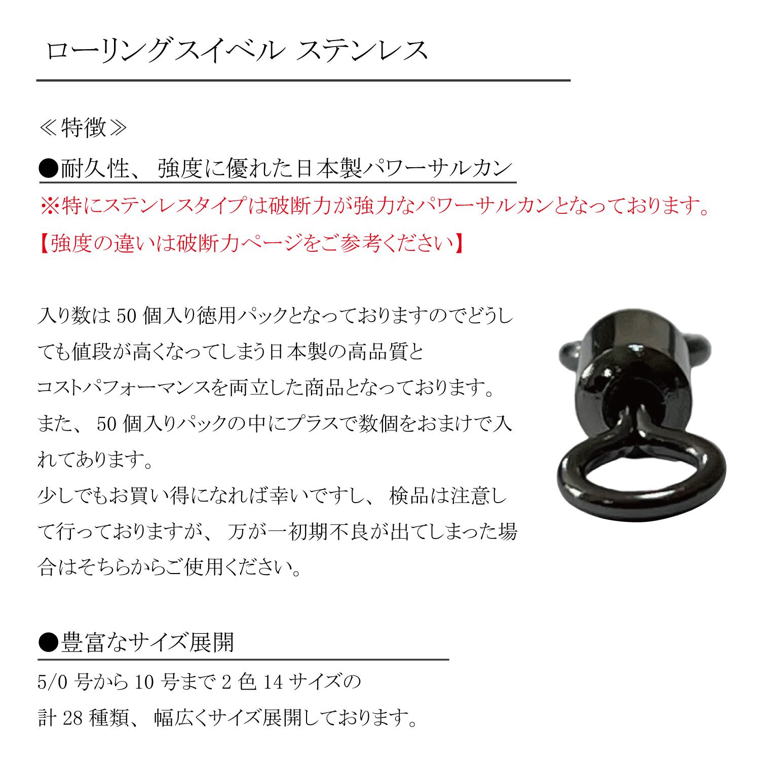 14サイズ展開と豊富なサイズ展開をしているステンレスパワーサルカンです。